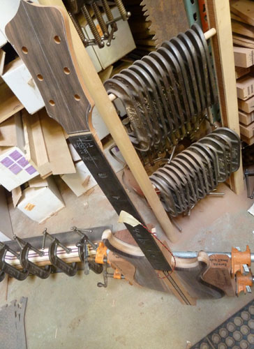 Scrapped the first top for this project - those little knots had some radiating stress fractures that we not Scott's cup of tea (I heard that mom is snagging them for her next guitar). We found a suitable replacement and continued with the building. Here's some stuff that happened since July: