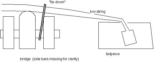 My solution has been to put a bend, gently, but sharply, on the ball end, such that the string exits the anchor slot as parallel as one can get toward the bridge; on some softer strings I have also done the following: taken a wee piece of core, or a short length of guitar string, wound .036 or so, and twist-tied the bit of string around the low string, using wee pliers, anchoring the segment of string between the bridge and tailpiece to the saddle adjuster screw, to provide just enough downward pressure to keep it solid on the saddle.
