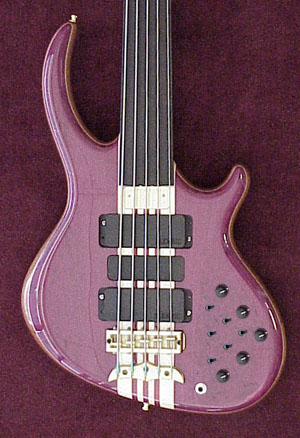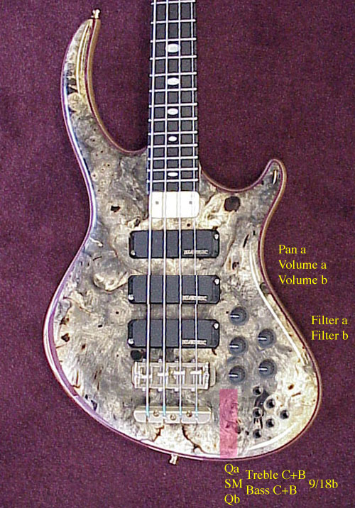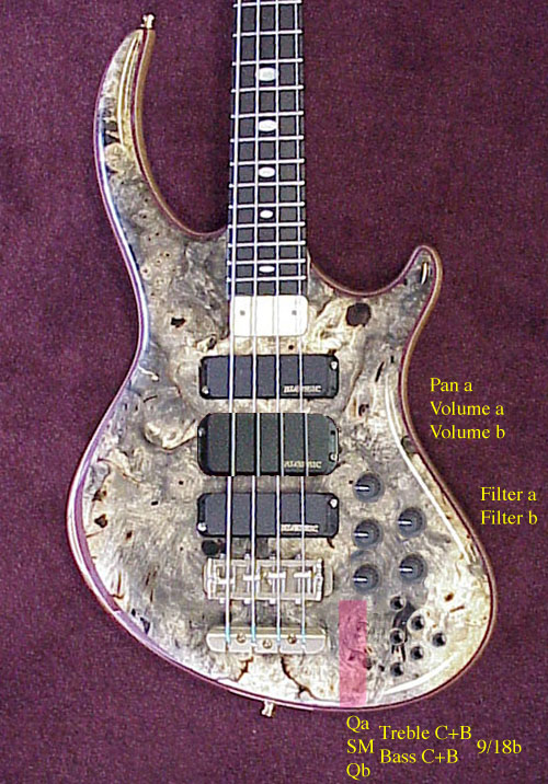 The pink area is no-man's land - the jack takes up a huge amount of room inside and nothing can be in that area. I had to swing it around to the back to make the bowling pin arrangement for the switches. You could move it to the other side of the switch cluster and move the switch cluster closer to the neck.   Controls with "a" label are for the bridge and middle pickup, "b" is for the neck pickup. Dad wants tot talk to you some about the 9/18V switch. You guys can email or talk on the phone, whichever is better.   Here's the FatBoy pickup in the middle: