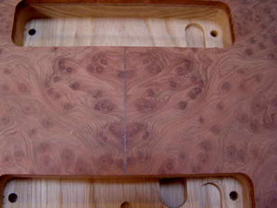 Mica, all I can say is....  Oh my.  Wow, I'm amazed.  The top is just gorgeous!  I expected it to be a little more red in color, but even this way, wow!  The extra accent laminates are definitely a nice touch, and I can see the difference in the pau ferro and purpleheart in the neck, even though the picture does really show it too well.  It's a great looking piece of art, kudos to you, and I can't wait to touch this thing for the first time.
