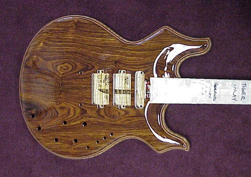 Your guitar was rubbed out on Friday morning, and started getting setup Friday afternoon. Here's a shot with the cover installed, and a peek at the jack plate for the Roland pickup: