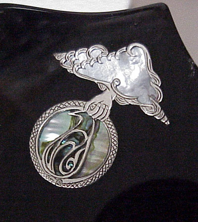 Brass and mother of pearl on a Gabon Ebony oval with brass binding.
