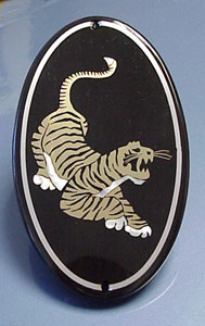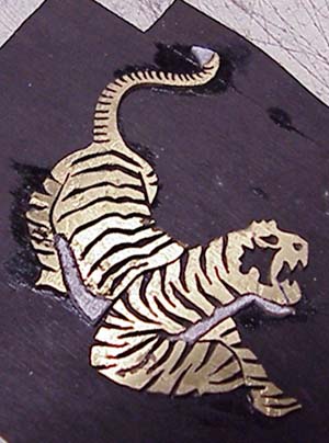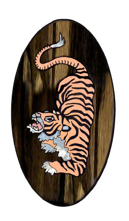 We're proposing Macassar Ebony for the background. The tiger's body is to be copper with Ebony fill for the stripes. Abalone, Mother of Pearl, antique ivory and pink ivory (wood) are for the other accents.