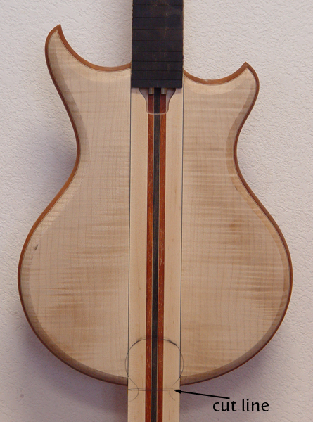 The cut line was to show you the shape you requested will be what's left, not with the more fleshy tips we usually have on the omega. I'm standing just slightly above, and the line isn't terribly distinct (looks like I'm pointing to the lower one instead of the upper one). Plus, there's some carving after the cut, so it's a teeny bit oversized. No matter where the omega is placed, there's going to be the same amount of framing veneer and neck chunk. And it will be smooth with the bottom edge of the guitar, regardless of my photo or a quick cut line.
