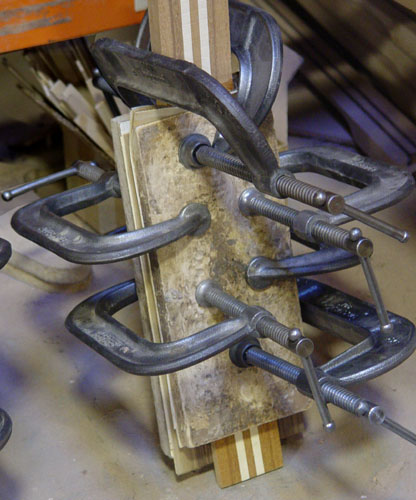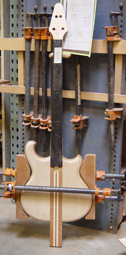 With all the body work done, the neck has been moving along. Here is the peghead veneers mid-glue:
