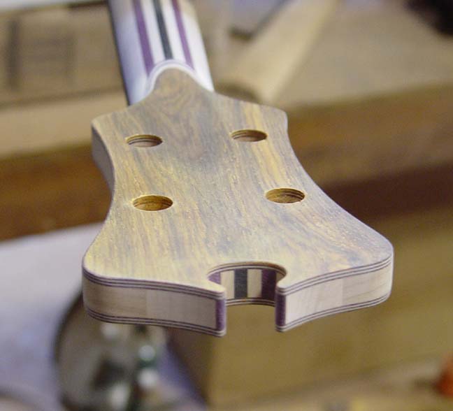 As one would expect, the balance and proportions are just perfect. And it's a rare treat to see the laminates inside the holes for the machine heads! I've been messing about with bridge blocks and pickups lately, and always get a kick out of seeing the wood cross-sections, but hadn't thought about taking out a tuner.
