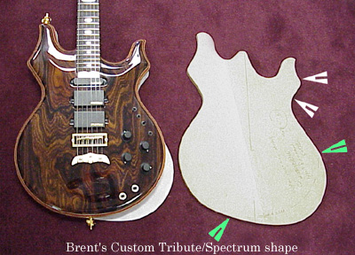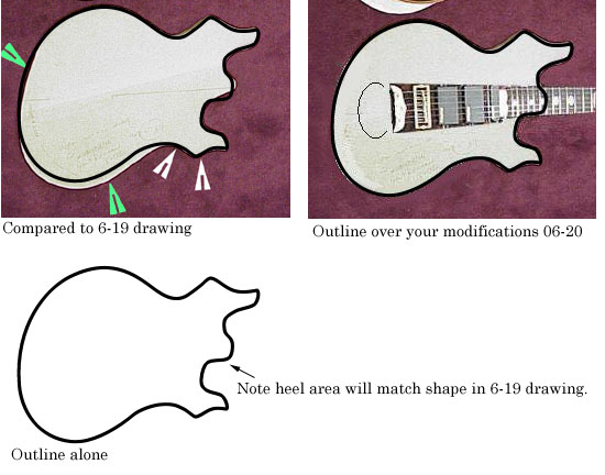 Be aware that the template always looks huge compared to the finished guitar, so I put a standard Tribute over the drawing of the new template to illustrate that your design isn't that much bigger.