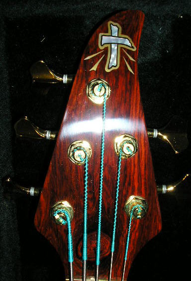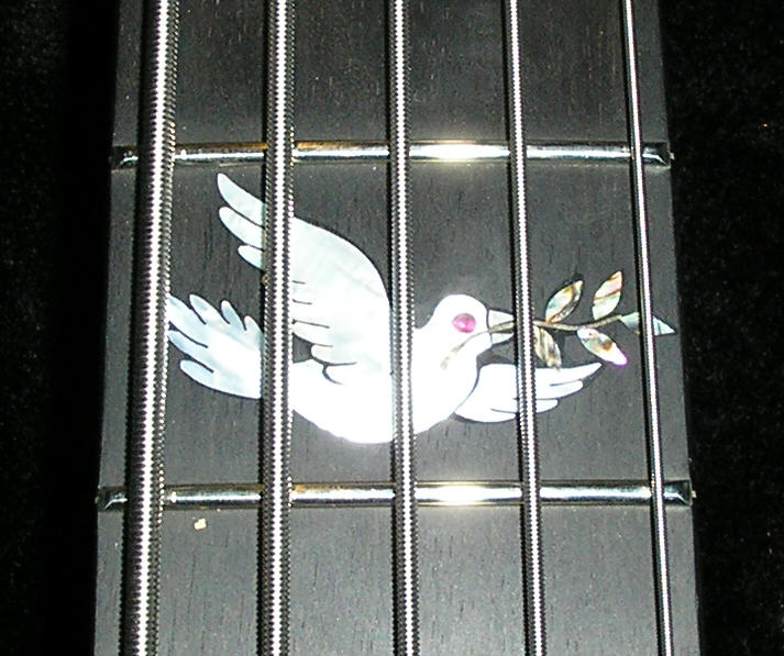 Please view the above photo of the inlay on your peghead. It came out great. Since you changed the specs on  the original order from chrome plated hardware to the polished brass I am of a mind that it was the hand of Providence that caused the finish just over the silver surrounding the Mother of Pearl Cross to turn amber. It actually makes the Mother of Pearl pop out more visually.  It will match the Gold Tuners, brass hardware and 14K gold olive branch far better than the cold silver.