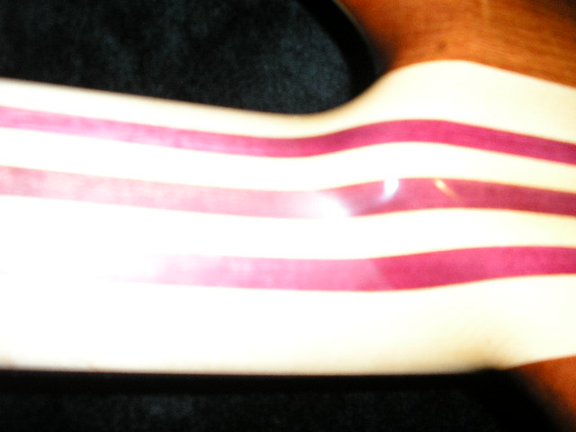 Just a hint for those of you planning your own custom, take the satin neck finish -- it makes playing when you sweat a whole lot easier... They did a georgeous job of the transitions.  At the top it perfectly aligned with the peghead laminates.  At the body it follows a beautiful ark as the neck moves out for the body:  Sean.
