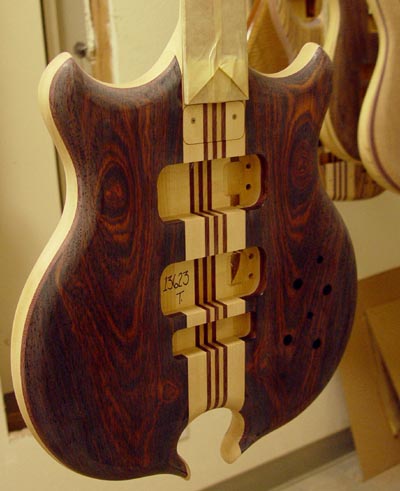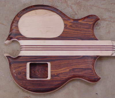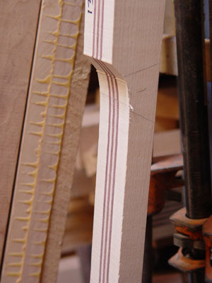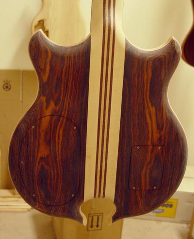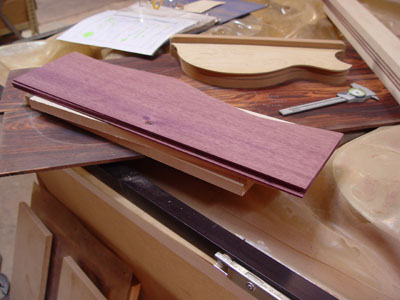 The dove inlay will be done very near the end of the process, when only 2-3 more coats of finish are needed. I discussed the inlay with James on Monday, and he agrees with me that in order to get a silver ouline around the dove we'll actually inlay the shell into a sterling silver sheet, then trim the sheet to leave a border around the dove, then inlay that into the fingerboard. Originally we were considering wrapping a silver wire around it, but we don't think that will come out as nicely.