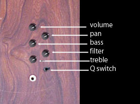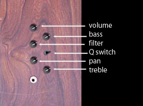Ok, I've been sitting at work staring at what I believe is your 2000 catalog and I like the way the layout of the purpleheart Series II bass on the first page looks.  It looks like the same layout as the 25th anniversary electronics, but for my bass minus the bridge CVQ, the PU selector, and the stereo jack.  Then have the Q switch where the master volume is, the pan where the neck PU Vol. is, the Vol. where the bridge Vol. is, the filter where the neck CVQ is, the Bass and Treble where the neck and bridge filters are respectively.  Whew! That was tough.  But anyways I'm not sure if it possible to make it that way but I like the layout, how it is not totally symetrical.