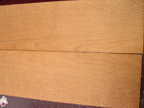 Veneer for the peghead cut from the same plank:  Lacewood for the top, with the upper half penciled in: