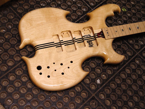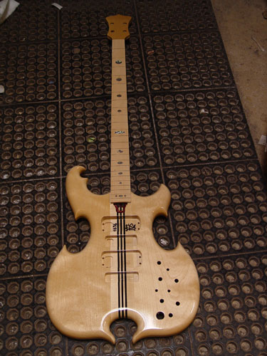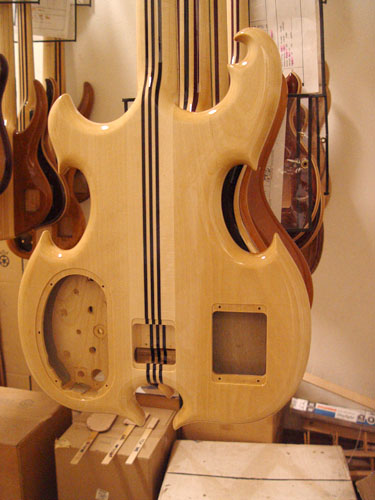I forgot to mention that besides the solid birch wings, triple Omega body and the maple fingerboard, this bass is quite custom because the neck has 3 pieces of Ebony and is reinforced with Graphite Bars to make it even stiffer. It will also have frtont Laser LEDS in Blue. Series II electronics, gloss finish and Gold Hardware complete the little monster (Mica calls him Spooky, I call him Son of a Birch!).