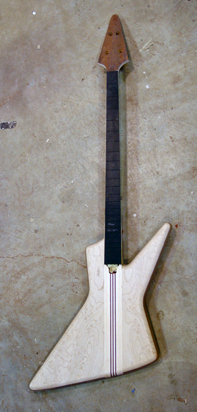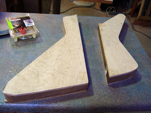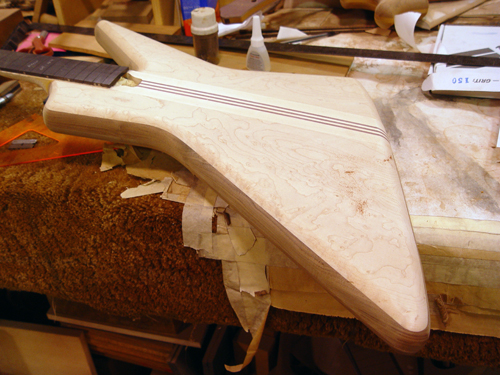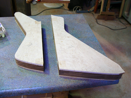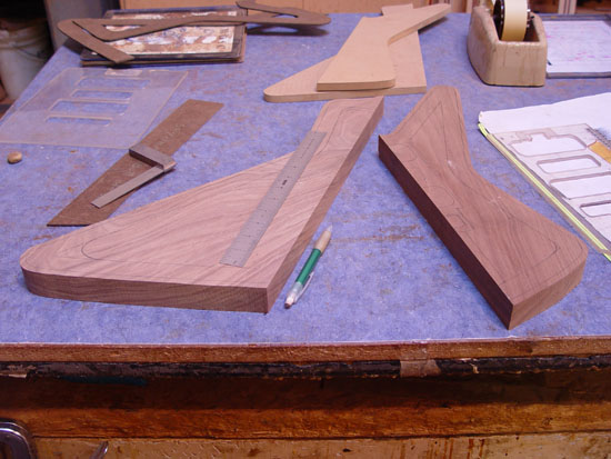Looks great.  Before we go into routing, can we take one more look at the body shape?  As you'll recall, we decided to make things a bit bigger in the event I didn't think the body shape was what I was looking for, and this will be a chance to make any changes if needed.  As it stands now, I think the upper horn needs to be more parallel to the fingerboard (as you guys told me previously - I should have listened to the experts! :-)), and the headstock looks a bit wide from what I can tell from the picture above.