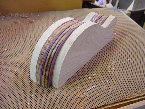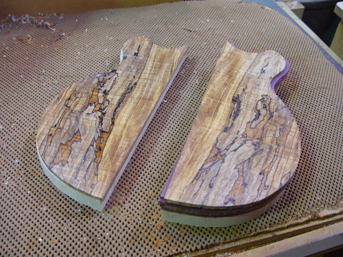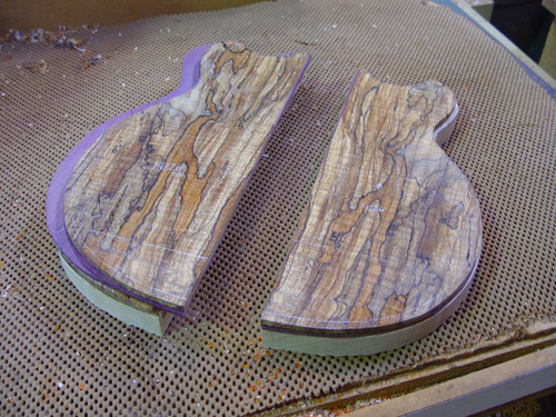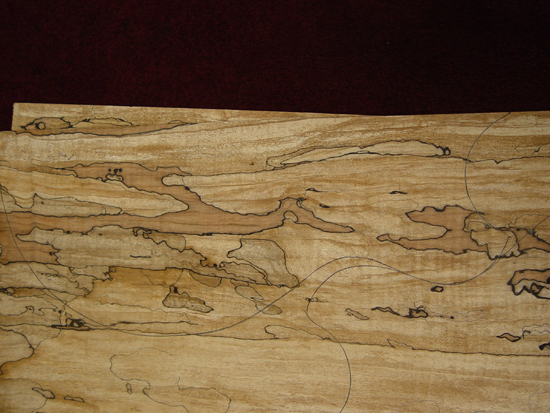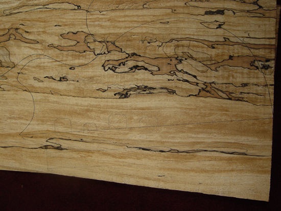With the rough positioning of the pickups sketched in. We thought that this piece would look better for the top, since it's a little plainer along the center where the strings, pickups, and hardware would obscure the figuring.