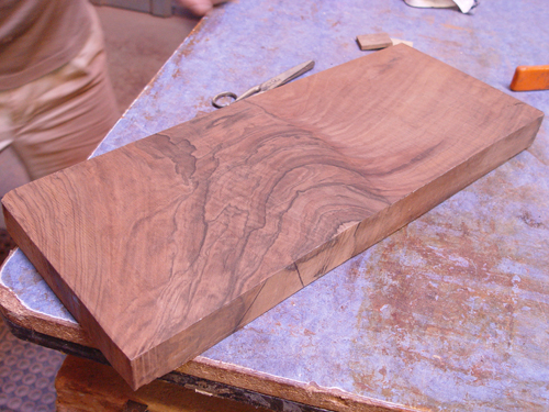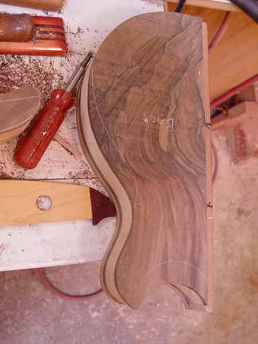 And the simple sandwich with Walnut top and back and Cherry core on the first shaping fixture: