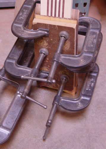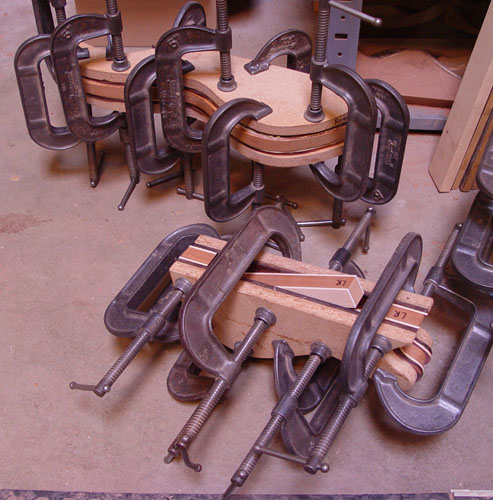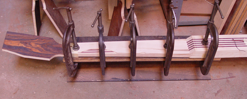 Note that the block for mounting the pickups will be glued in later - it's there for space only. We have to seal and shield the interior before that piece is glued in place.  And the matching peghead veneers getting clamped: