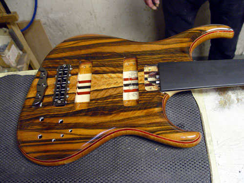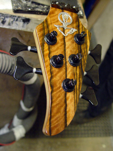 I love the colors in the ebony. Mac ebony has such a grey-green tint that pops to that incredible, grey/gold with finish. The black hardware is the perfect complement to that color tone. It's a beauty. One of those basses it may be hard to stop staring at in order to play it.