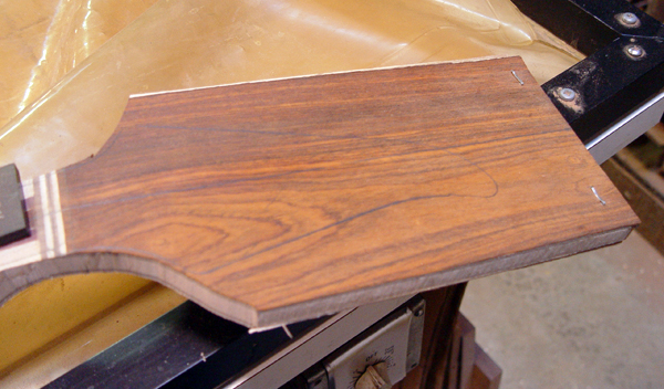 Fingerboard is made, LEDs wired, and peghead veneers in place. Next stop, cut the peghead shape out: