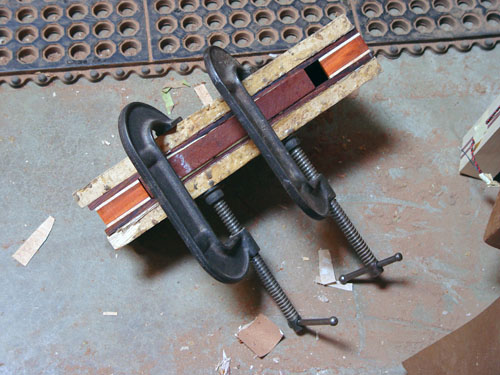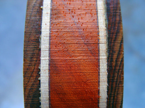 Shows the sandwich view of Coco Bolo Maple laminate Purpleheart pinstripe Vermilion core The other half getting the mounting block blued in place: