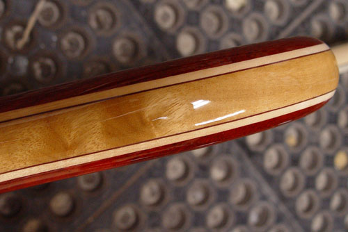 The Vermilion starts out lighter, and darkens with age. This piece had oxidized less than others in storage, and so we started with it since Michael wanted a lighter color. As with all Vermilion, it will darken over time, but good habits, like keeping it in the case when you're not playing will keep the light from changing the color as quickly. It's a striking piece with interlocked grain.