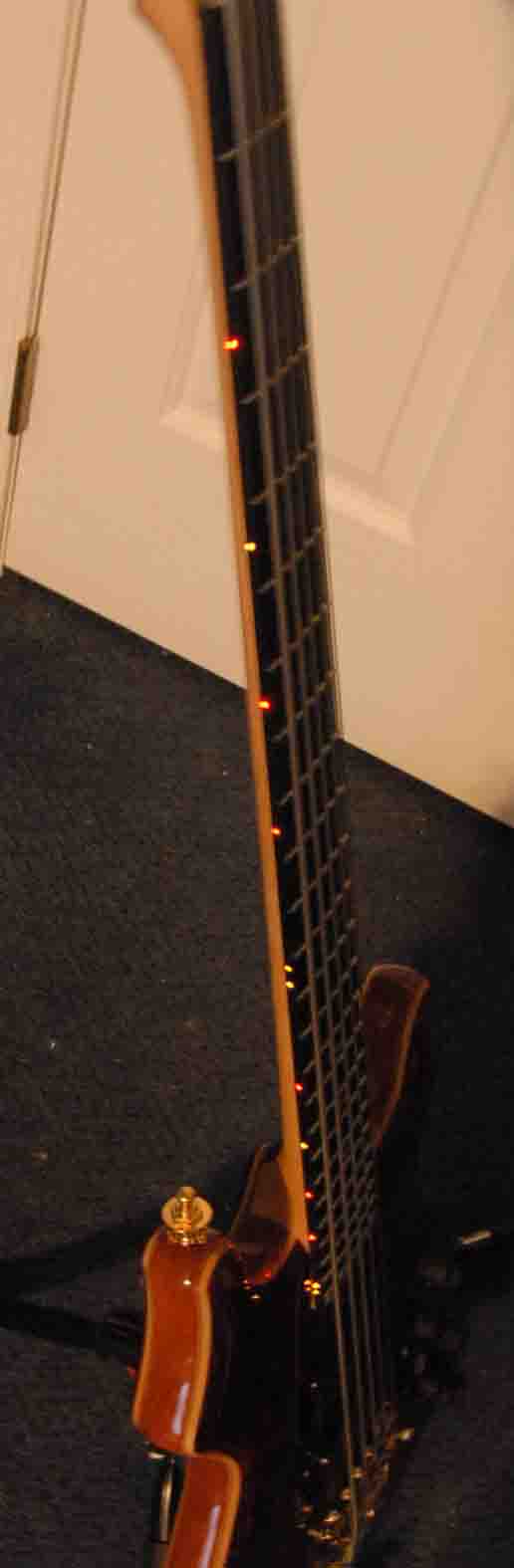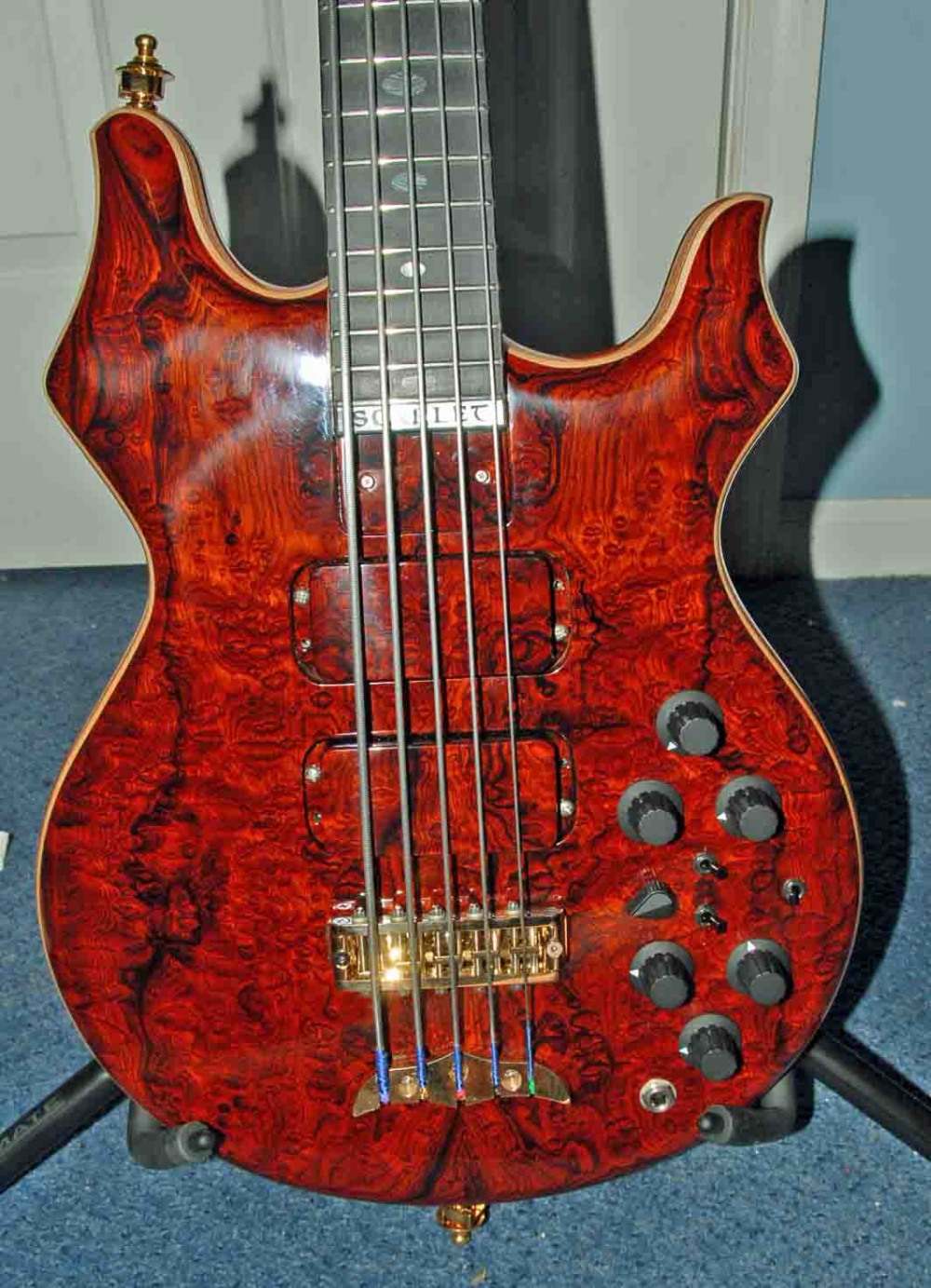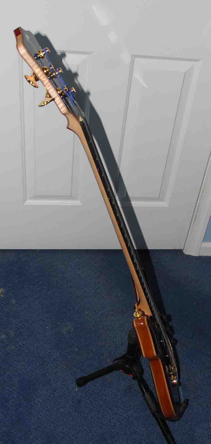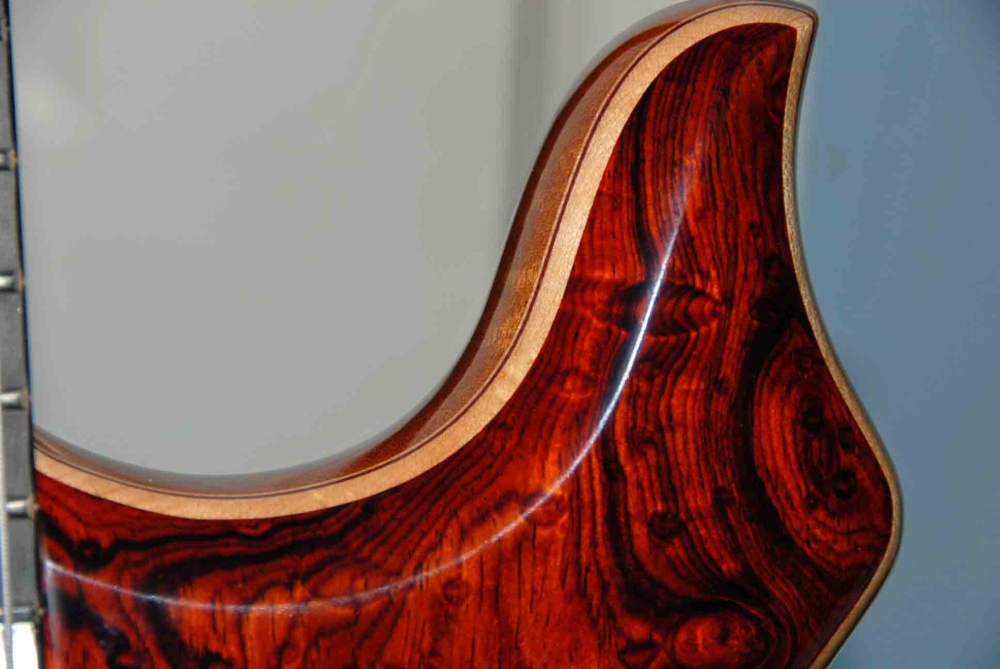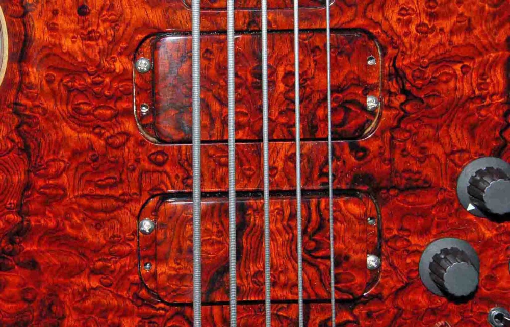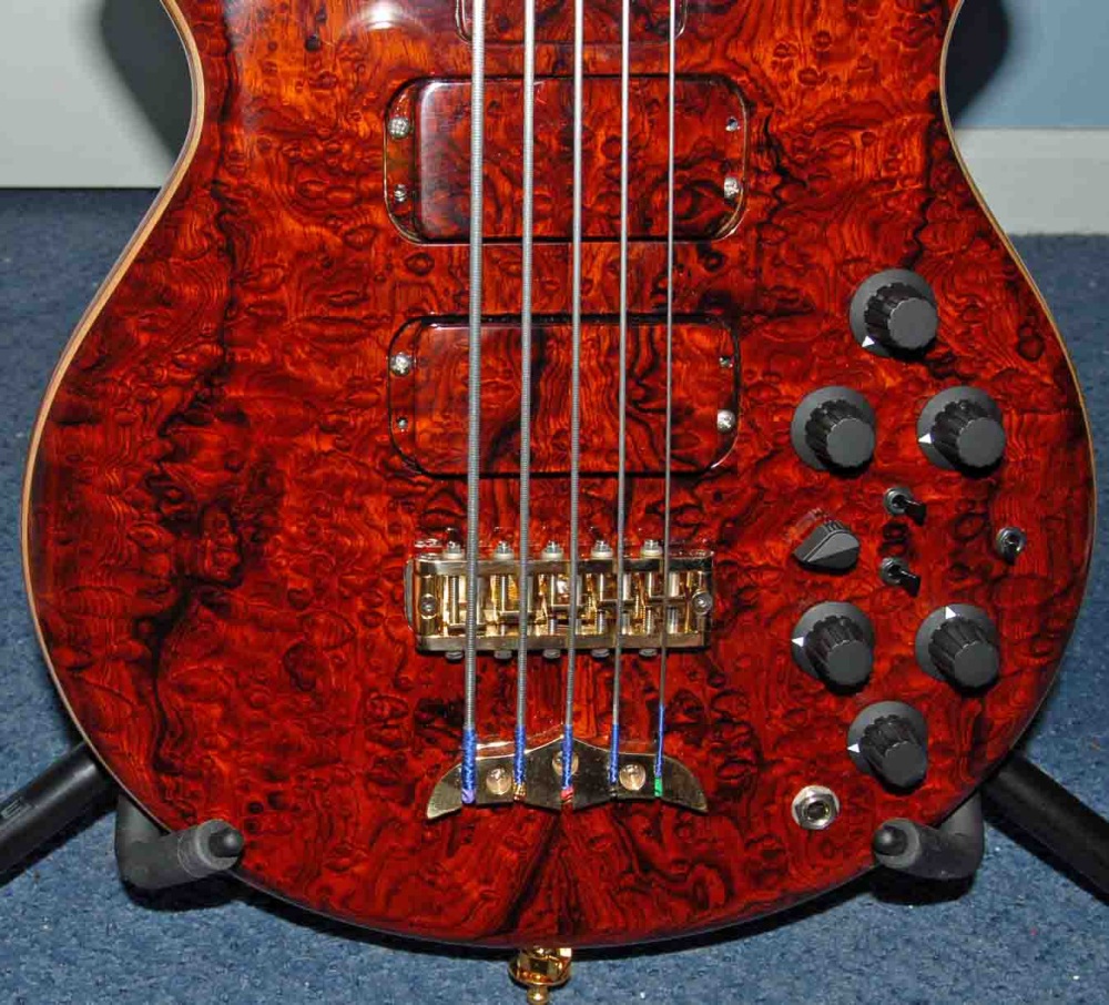 it has a definite voice. very clean on the upper end- low rumble bass on the bottom- so many knobs to play with yet. i need to do a slight tweak on the pups. up on the g with the bridge and down on the g on the neck. thats my usual setting. the neck pup is about almost .625 inch below the string and its fn loud. the bridge pup was moved up .375 inch from the bridge to get a bit less highs, that worked fine. i may go inside the electronics one day and raise the output on that pup. one thing i do notice thats different from wolf. this has a little more acoustic for lack of a better term sound. its full and seems to have a bit of compression built into it. its got the heavier guage chromes on it and mica tested it with alembics on it also and is sending me that set to try, i am not a big fan of rounds, but i will give it try when i changes strings