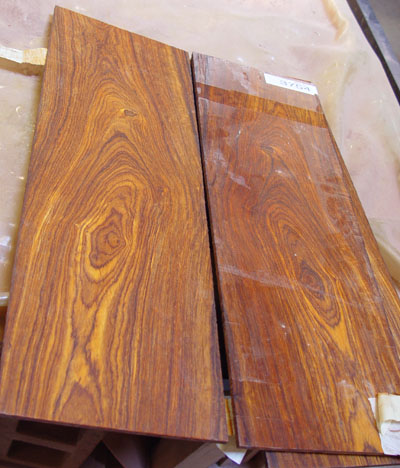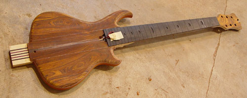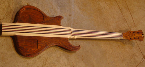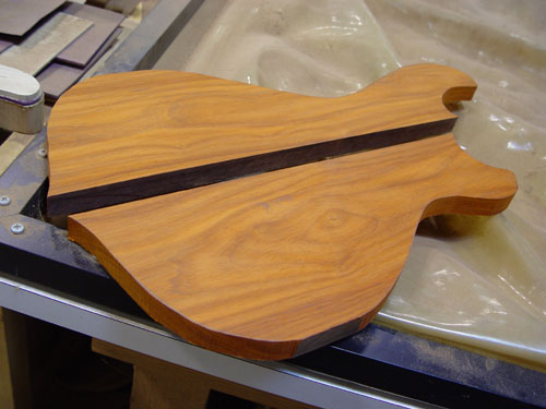 Wow, nice bass! It reminds me of my own (custom of the month June 1999 -in the custom archives)in a couple of ways. The bookmatched-to-center... it looks like coco bolo... wood has similar figurings (liney in the middle -which helps disguise the centerline- and more detailed away from the center).