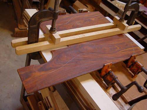I bet you'll want to see the body laminates - sinec the one I took a picture of while you were visiting was changed later ;)  Here's the top and back as of today, with a complete compliment of official shop dust: