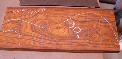 Alternatively, another thing that intrigues me would be to FLIP the outline, that is, to imagine the UPPER edge of the board (in the picture) being the center line/line of symettry. I like the pinch/pinching that's around the date 4/10/07 that you have chalked in on the board... it looks neat. The only concern would be if that figuring wouldn't line up right... BUT it looks like the fingerboard and or truss rod plate and/or pickups would be there, so it wouldn't be an issue -at least for the top. That way, you could get most of the really cool area in the middle on my top, and what you have as the outer edge would become the center, and what you have as the center would be the outer edge... and it looks like it would be full of concentrics!!! The lines on the top seem more parallel to begin with.