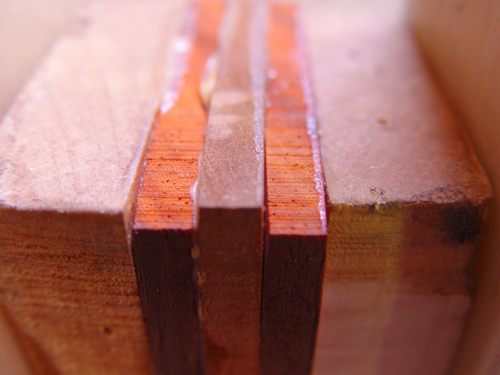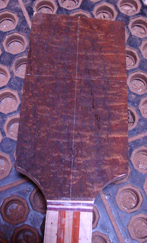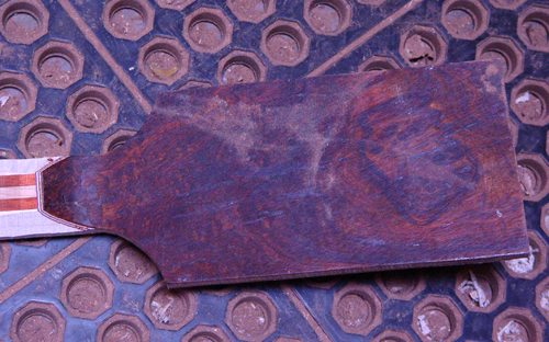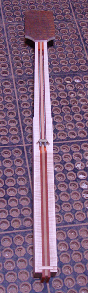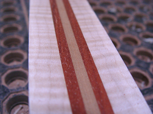 Flame Maple, Vermilion, Cherry, Vermilion, Flame Maple. This is the scrap end of the neck, and the colors will liven up once we start sanding and scraping.
