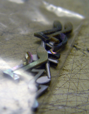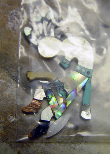 I know it's hard to only see the back, but the front has even more glue obscuring the shell, so it's harder to see anything. James left these in little baggies, and I dare not risk removing them for fear of losing a tiny piece. Here's the notes: