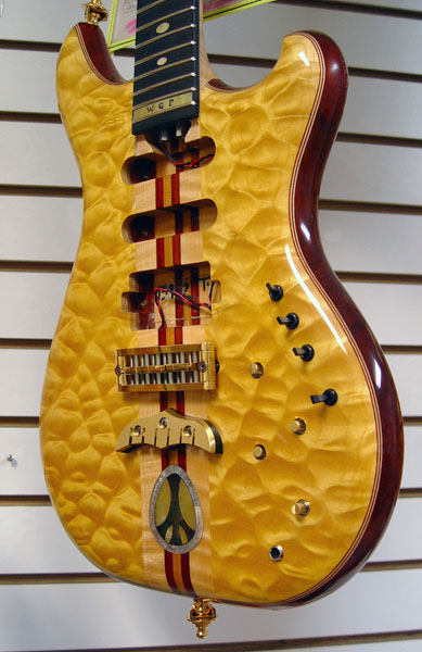 As for a name, I've been mulling world justice and peace for the three front inlays, top to bottom. Maybe Woody, since the quote inlaid around the peace sign is the descendent of This Machine Kills Facists, the quote Woody Guthrie wrote on his guitar. Or perhaps The Elephant because elephants have a looooonnnnggg gestation period (lol). Or The Waiter (not because it serves food). I'm certainly open to suggestions.