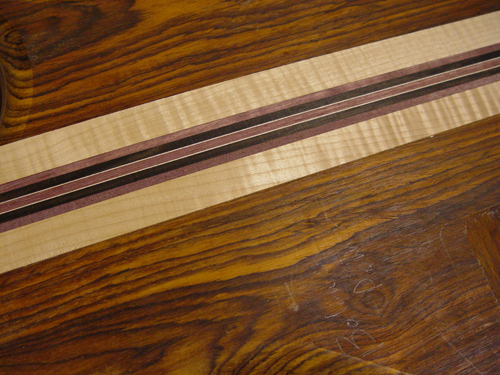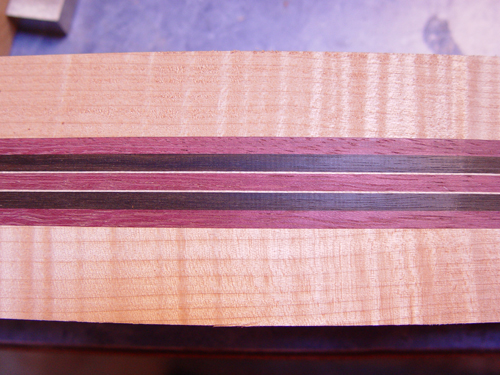 Mica, WOW, and thanks so much for the photos! It looks incredibly beautiful already but I am confused about the body laminates. I did not ask for the wide laminate to be Purpleheart. That said, is that a maple laminate between the Coco and the purpleheart or just a glue line? If its Maple, Cool. If it's glue I'm afraid we have a problem.  Mike