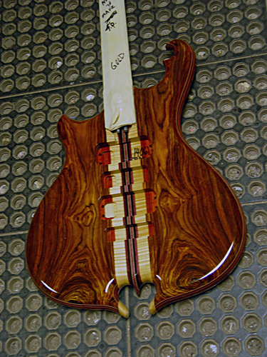 Mica tells me additional photos will be coming soon! The bass is presently in the beginning stages of finish. A sealer coat as of yesterday! This is the point where you start to get a knot in your stomach from the anticipation of the Grand Unveiling. Now you start second-guessing yourself wondering:
