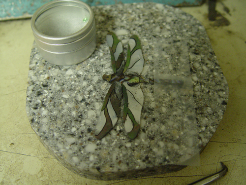 There's some dark glue covering some of the white mother of pearl, so don't worry, the shell layout is the same as the mock up. The forked end of the tail is getting cut tomorrow. The little container next it is holding the emerald eyes.