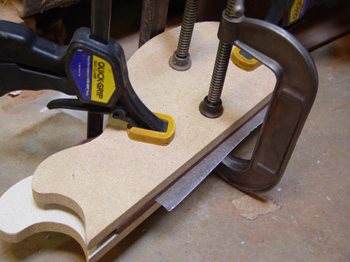 Not much to see, but it's your back laminate in those clamps, with the wood getting glued in place for the plate shelf: