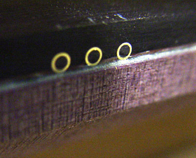 Don't freak out! I can see the purpleheart and ebony veneers under the fingerboard on the bass, the lighting in this shot doesn't show them but I know they are there! Here's the first gold inlays around LEDs (these at the 12th fret):