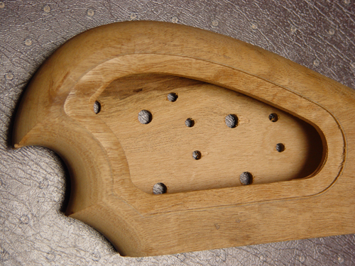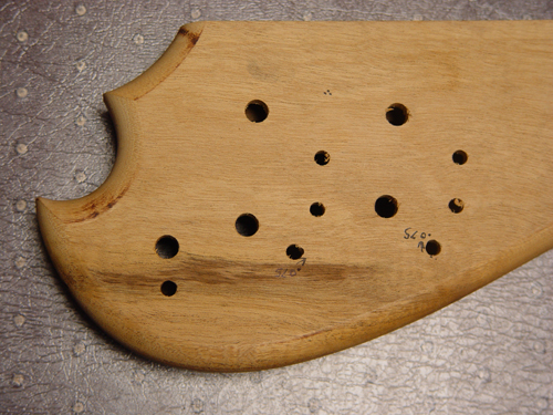 1. I don't see a hole for the pickup selector.  It was located between the two volume switches in the orignal mockup.  There seems to be a marking in this picture at about that point, but not sure if that's why it's there.