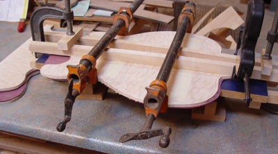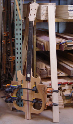 Your Quilted Maple custom Mark King is shaping up in the assembly department:  The neck is rough shaped, fingerboard in place with the Mahogany body gluing up: