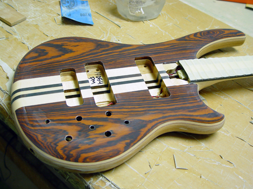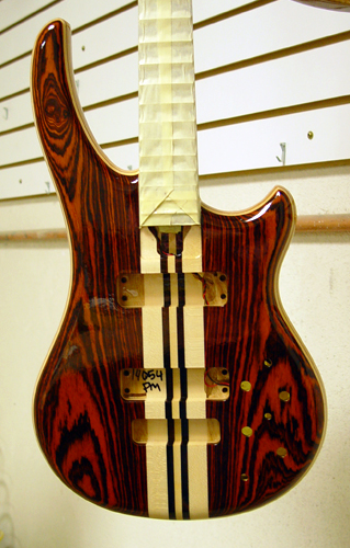 We cut the neck off this bass when it had a catastrophic failure days before shipping (hey, it happens). We replaced the neck, and when it was delivered, Hardy discovered that the 24th fret dimension was incorrectly applied. We can't take a neck off a second time, so the bass in these build records is actually hanging in our showroom right now.
