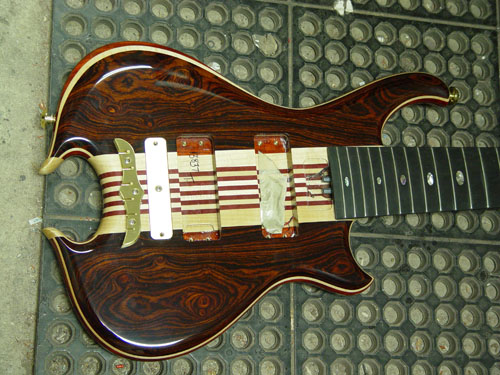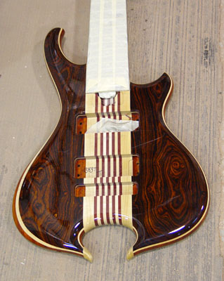 I sounds stupid but seen the bevel in the headstock and the maple accent around the body, I would line the outer sides of the fretboard also with a maple accent. Got it. So the fretmarks are in fact instead of white lines on a dark sideline, dark lines on a maple sideline. The effect would be a complete contoured bass in maple aroud dark wood.
