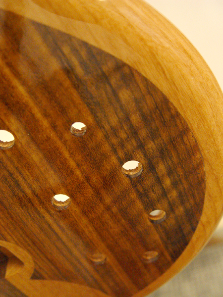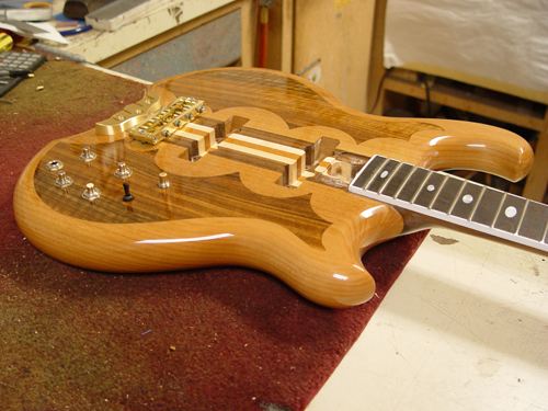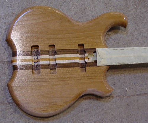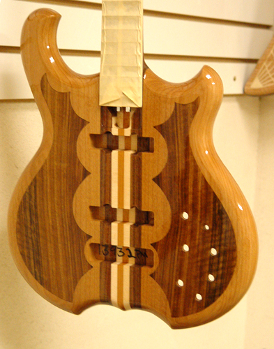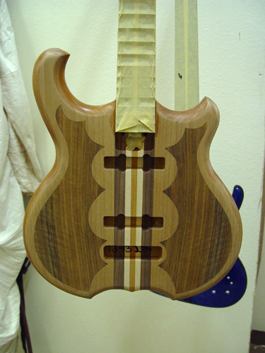 We lined up the bottom points with the cutout points. Peter did a great job on the top inlay, both in the shape and in the excecution. Once there's some finish on this guy, it will look better yet.