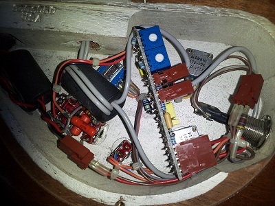 The pickup leads are the two gray colored wire bundles that are coming in from the hole on the top of the cavity.  They are looped together through a ferrite bead (this helps kill off high frequency RFI noise, then each lead goes off to a separate connector which is plugged into the main EQ board.