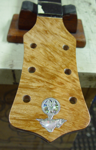 Jon finished the rubout, and brought it in the setup room today to start assembling all the goodies. I got this nice shot of the peghead with inlay: