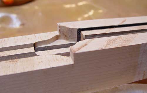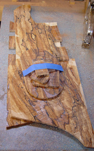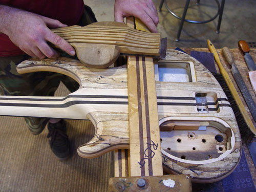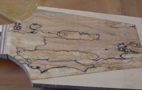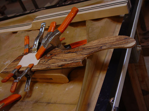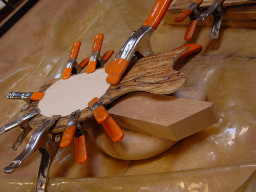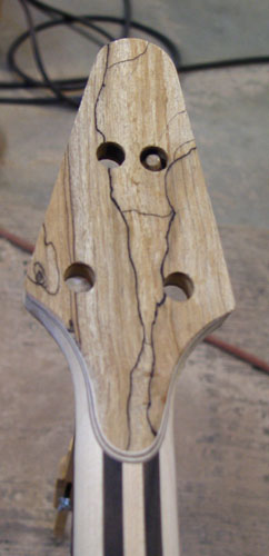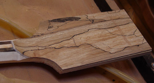 Wow, can't wait to see this one finished. The ebony neck laminates really set off the spalted maple - in all, the 'colour scheme' looks to as near perfect as possible.