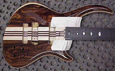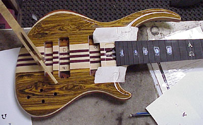 Tony just finished cutting out the abalone for the Alpha and Omega inlays and he's setting them in the fingerboard now. The basses are also getting fretted today after the inlays go in - that's why the protective tape is on the bodies.   I think both tops are amazing looking. Isn't that Bocate cool?