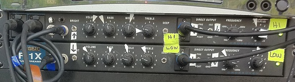 So instead of using the high/low outs on the back he is using 2 F-!X's , one for highs,one for lows...with a tone stack available for each.