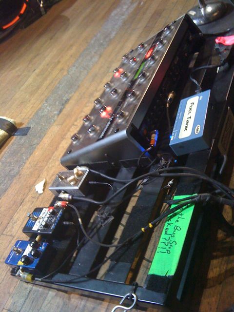 The multi-effect is a TC G-System. When my Lexicon G2 became unrepairable, I thought about getting one of these, but decided to go with Eventide. I'm not sure I made the right decision, although I do think the Eventide sounds are amazing, the TC seems to have an ergonomic advantage. One cool thing about the G-System is that you can remove the actual processor from the foot pedal and rack mount it while keeping the pedal on the floor.