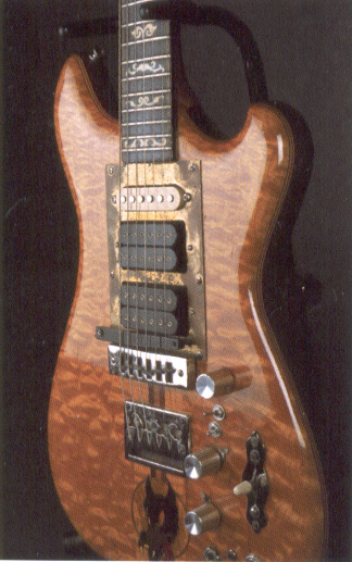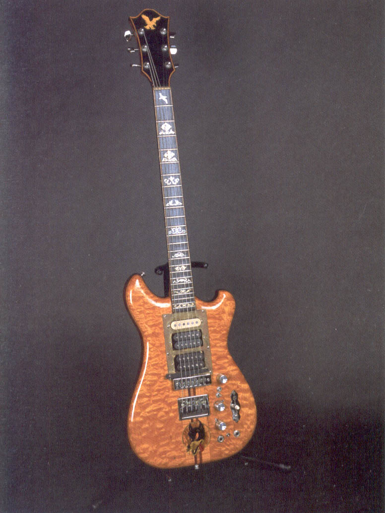 here is the original ALEMBIC wolf- despite the fact that doug irwin replaced the headstock veneer/inlay and branded it an irwin-we all know where this beauty started life. This is the only photo I could find with a clear image of the alembic symbol on the headstock and the original inlay-also notice the wolf sticker is not there yet