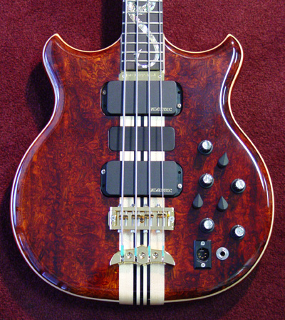 As much as it seems a super-custom bass, it's really very standard.  The neck is maple/ebony with an extremely narrow profile, the top is an awesome piece of wood, and the neck and headstock inlays are spectacular.  Beyond that, it seems to be a 'generic' Series II in an SC shape.